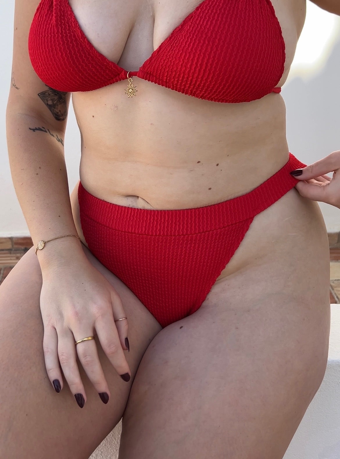 Este bikini de corte triangular y cintura alta seguro será tu nuevo favorito. Con una pretina elástica más gruesa, nuestra clásica tela arrugada texturizada y una cobertura trasera atrevida, será un básico imprescindible en tu armario. Perfecto para relajarte, aventurarte y, por supuesto, nadar.